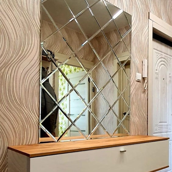 Использовалась серебристая зеркальная плитка формы "вытянутый ромб".